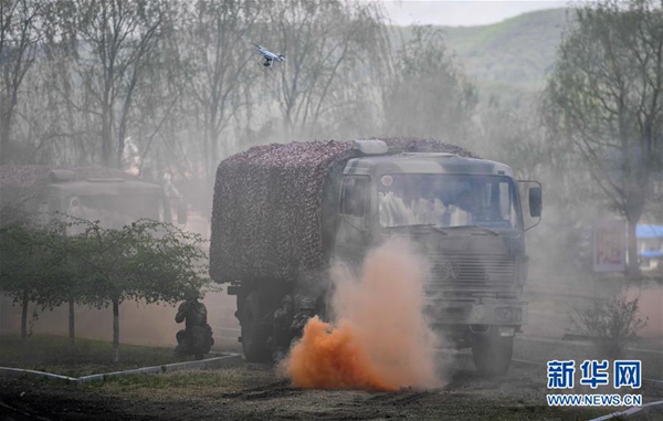 5月6日,沈陽聯勤保障中心某汽車運輸旅一營戰士進行無人機處突演練。新華社記者 許暢 攝