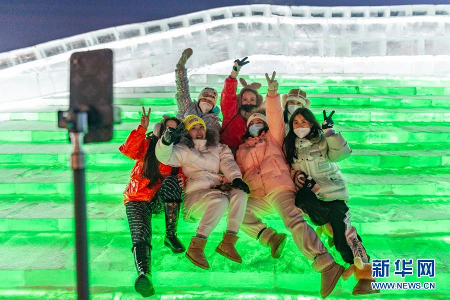 2020年12月24日,游客在哈爾濱冰雪大世界園區內自拍。