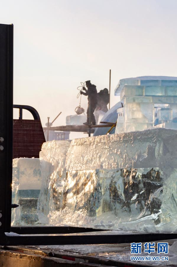 2020年12月31日,在哈爾濱斯大林公園,工人在建造一處冰建景觀。