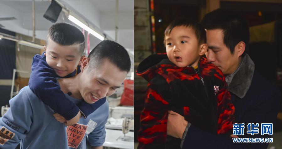 拼版照片:左圖為2021年1月26日,在福建省石獅市的金利萊斯服裝廠,聰聰和黃海龍在一起;右圖為2018年2月2日凌晨,黃海龍即將登上返回四川的長途車,在上車前抱著不滿3歲的聰聰難舍難分。