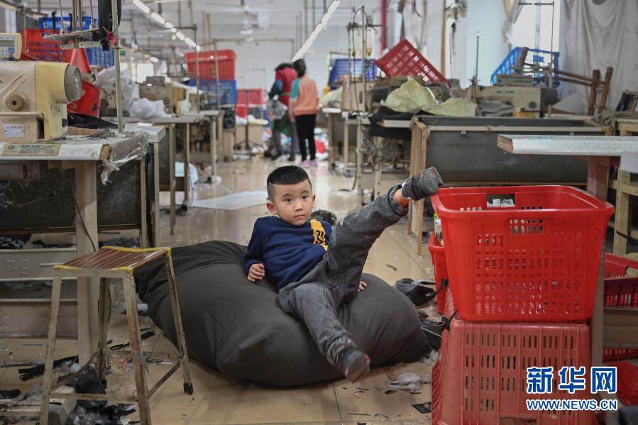 1月26日,在福建省石獅市的金利萊斯服裝廠,聰聰坐在準(zhǔn)備寄回老家的禮物布袋上玩耍。