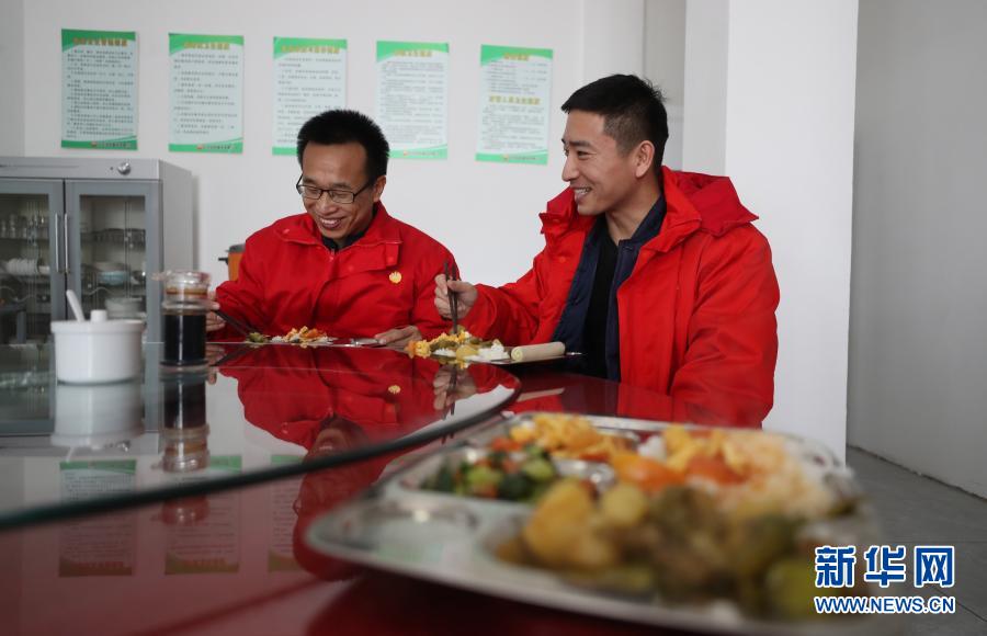 2月3日,在遼河油田建設(shè)有限公司管道第三項(xiàng)目部,來(lái)自河北衡水的概預(yù)算管理人員王殿凱(左)和來(lái)自河北邢臺(tái)的工程技術(shù)人員張浩在食堂吃飯。今年他們都留在當(dāng)?shù)剡^年。