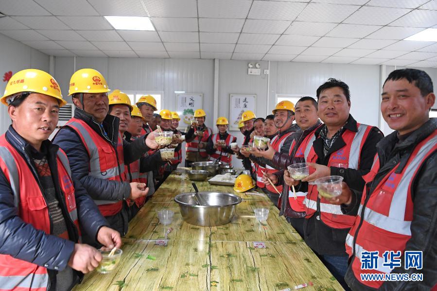 中鐵四局建筑工人們在安九高鐵江西段長江特大橋工地食堂聚餐(2月4日攝)。