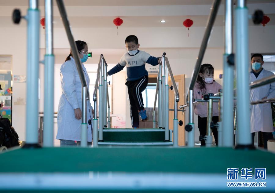 在哈爾濱博能中醫(yī)門診部,劉雨晴(左一)為腦癱兒童進行康復(fù)訓(xùn)練(2月2日攝)。