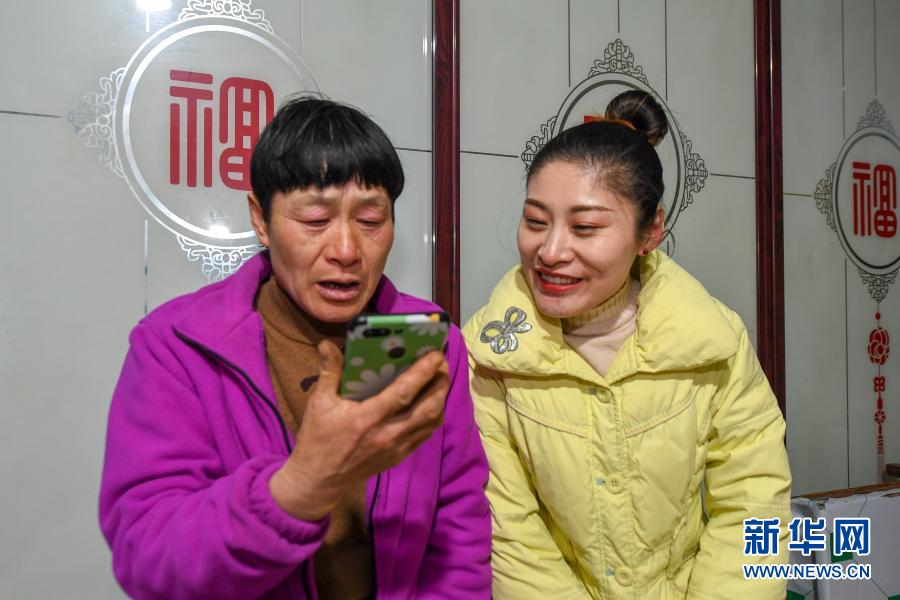 2月9日,在吉林省長春市農安縣楊樹林鄉牛尾巴山村,付寶印的母親鐘士輝(左)與付寶印姐姐付寶賀用手機與付寶印視頻通話。新華社記者 張楠 攝