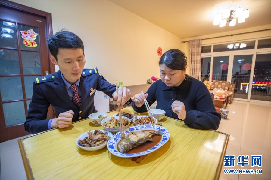 2月10日,付寶印與妻子孫夢潔在重慶市渝中區(qū)家中吃晚飯。新華社記者 黃偉 攝