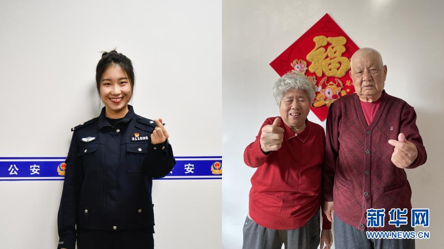拼版照片:左圖為2月11日,楊曉惠在天津市紅橋區芥園派出所比心(孫凡越 攝),右圖為2月11日,在河北邯鄲居住的楊曉惠的爺爺與奶奶在家中比心(王洪超 攝)。新華社發