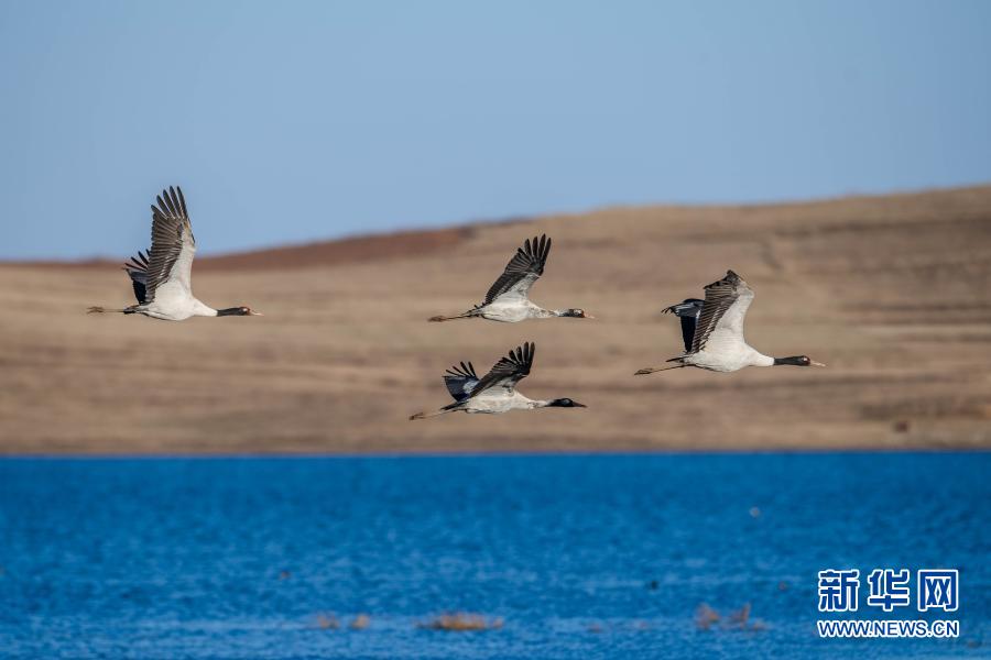 黑頸鶴在大山包黑頸鶴國家級自然保護(hù)區(qū)飛翔(2月24日攝)。新華社記者 胡超 攝