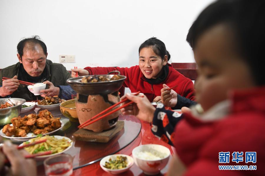 元宵佳節,張志菊(中)和家人一起吃晚飯(2月26日攝)。