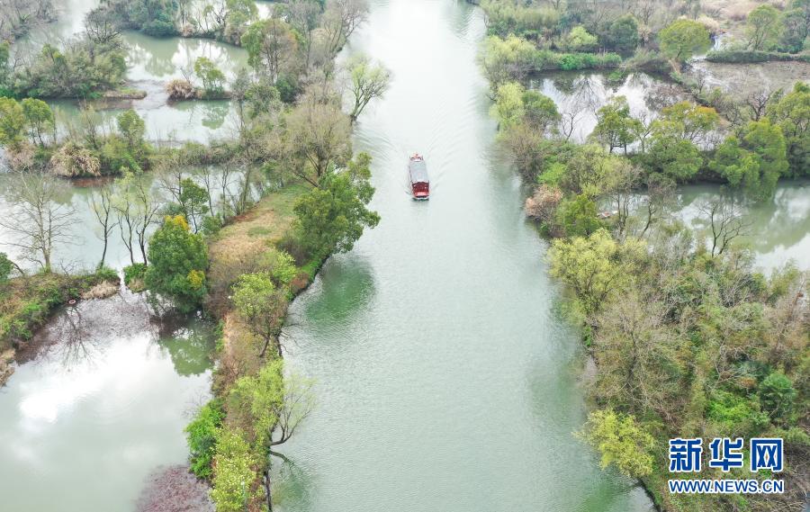 3月2日,游船行駛在西溪濕地水道上(無人機照片)。
