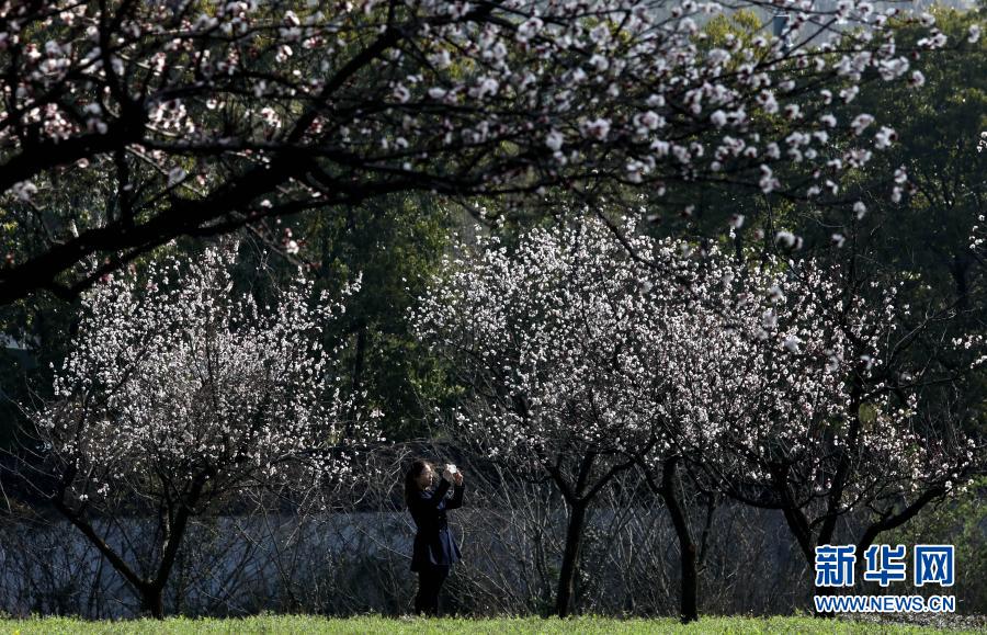 3月2日,游客在蘇州上方山國(guó)家森林公園內(nèi)觀賞杏花。新華社發(fā)(杭興微 攝)
