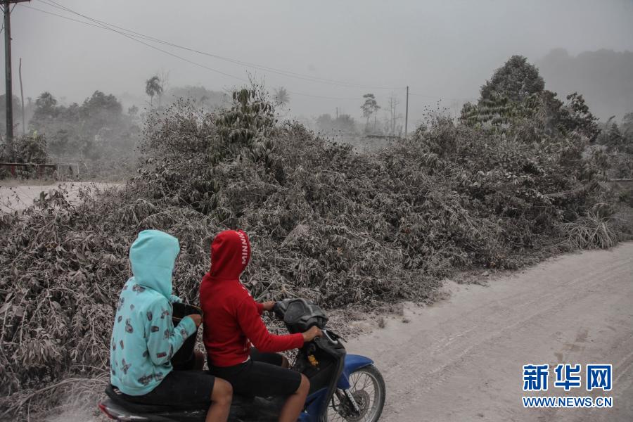 3月2日,印度尼西亞北蘇門答臘省卡羅的居民行駛在火山灰覆蓋的道路上。