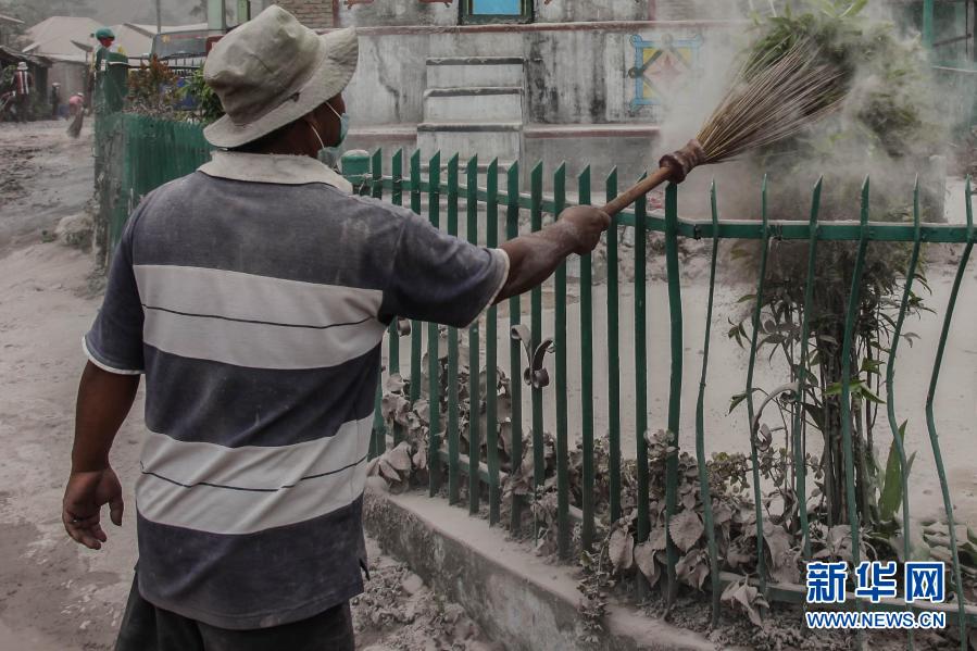 3月2日,印度尼西亞北蘇門答臘省卡羅的居民清除錫納朋火山噴發出的火山灰。