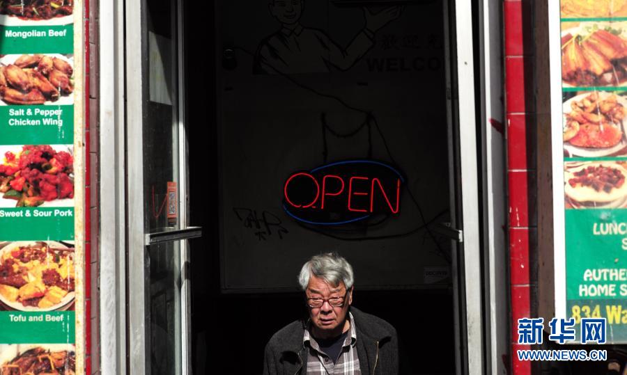 3月3日,一名男子從美國加利福尼亞州舊金山唐人街一家營業的餐館里走出。新華社記者 吳曉凌 攝