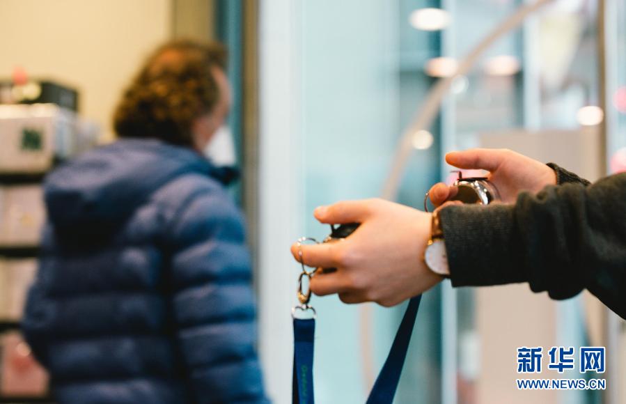 3月8日,德國科隆一家書店的工作人員在入口處手拿計數器限制客流。