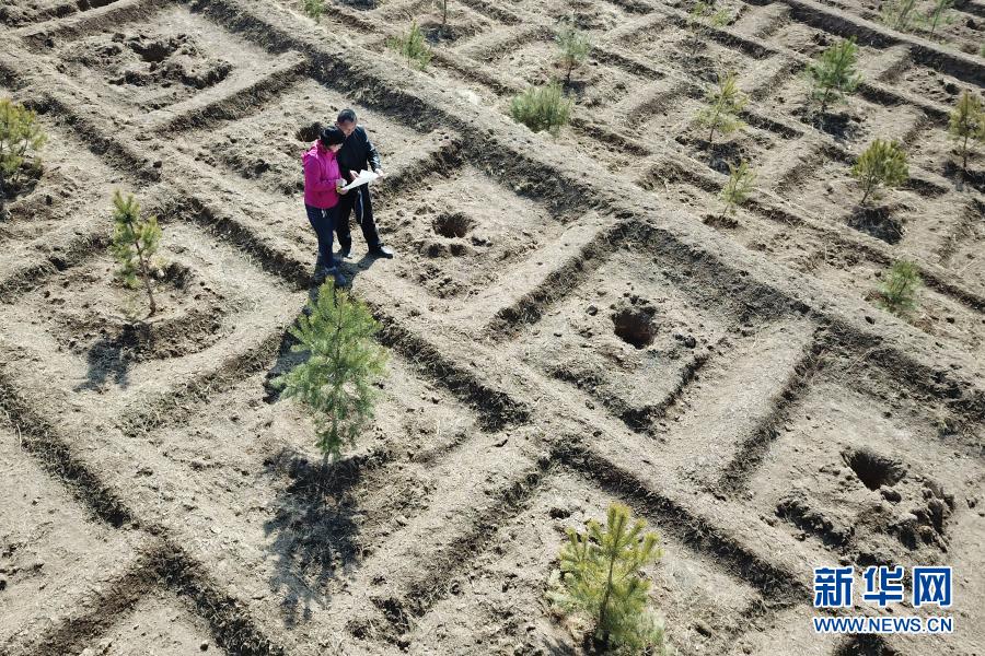 3月11日,在平?jīng)鍪嗅轻紖^(qū)白水鎮(zhèn)焦莊村北山,張文玉(左)和同事討論植樹造林細節(jié)(無人機照片)。