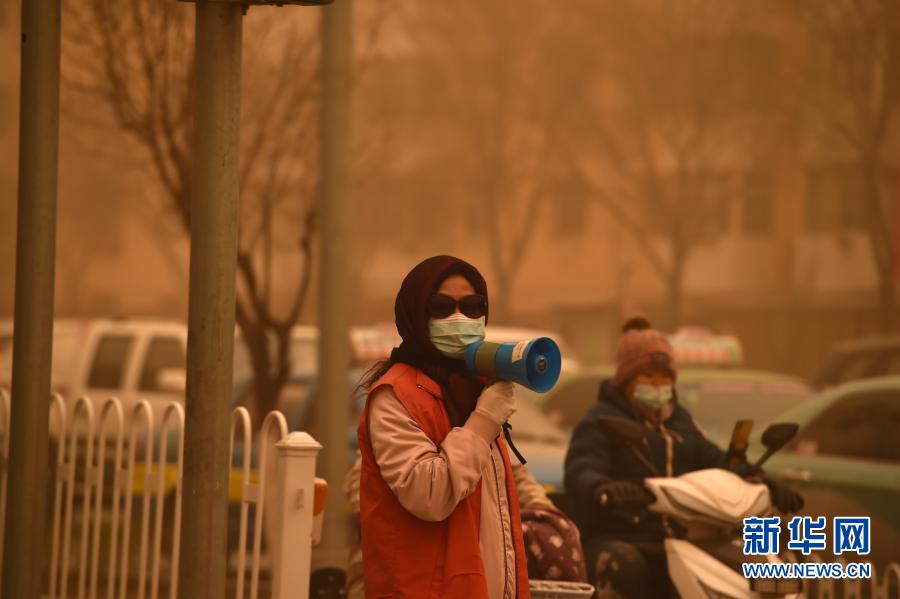 3月15日,在寧夏銀川市,志愿者在沙塵中引導(dǎo)市民出行。當日,我國北方多地出現(xiàn)沙塵天氣。新華社記者 唐如峰 攝