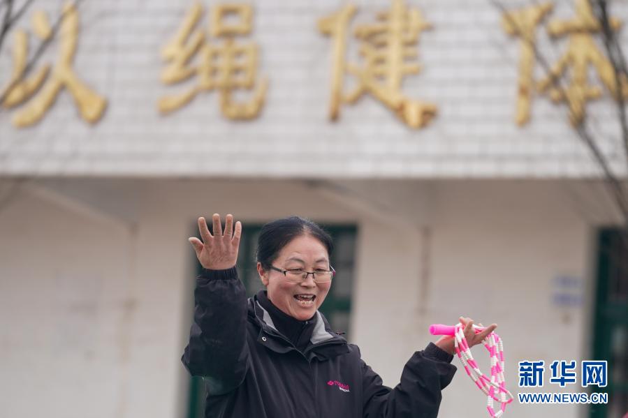 騎路小學劉彥老師為正在跳繩的學生們加油打氣(3月9日攝)。新華社記者 李博 攝