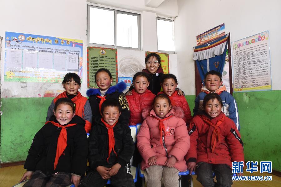 3月16日,在索加鄉(xiāng)寄宿小學(xué),達(dá)哇才吉老師(后排中)和學(xué)生在一起。新華社記者 韓方方 攝