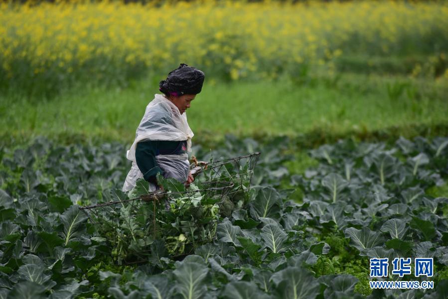 3月20日,村民在貴州省丹寨縣揚武鎮金湖社區蔬菜種植基地采收西藍花。