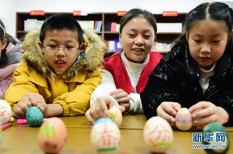 3月20日,在江蘇省鎮江市新金江社區,江蘇大學志愿者和小朋友一起玩“立蛋”游戲。