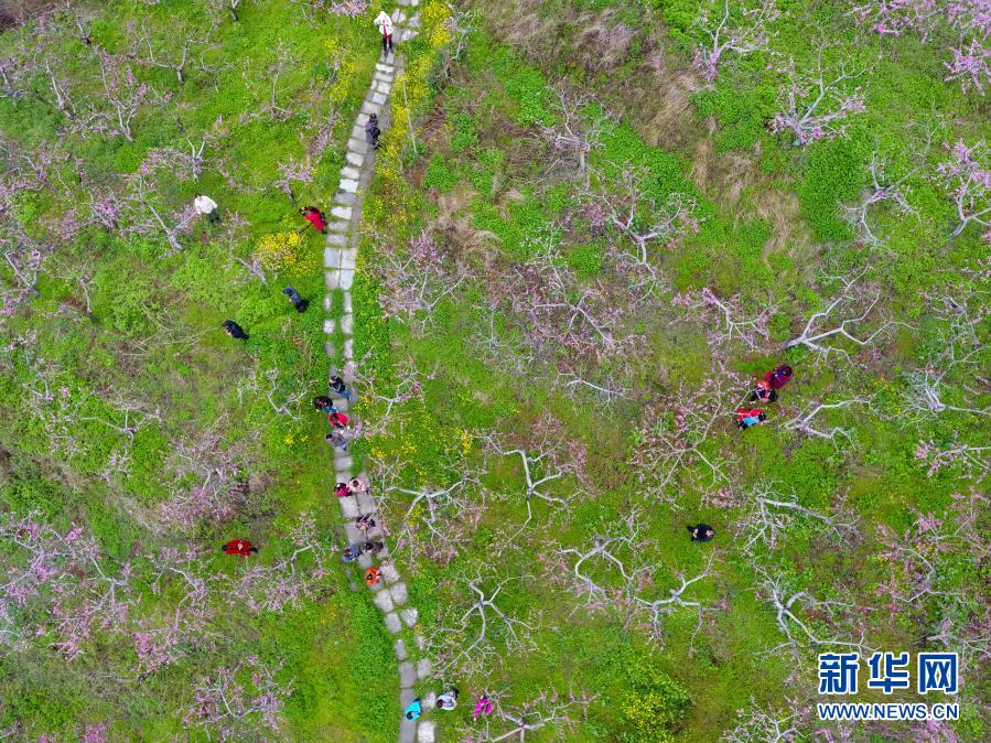 3月20日,游客在湖北襄陽(yáng)襄城區(qū)尹集鄉(xiāng)的桃花嶺踏青賞花(無(wú)人機(jī)拍攝)。