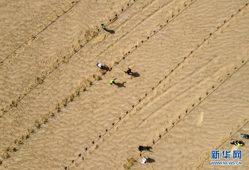 3月28日,人們在且末縣城不遠處的塔克拉瑪干沙漠內植樹(無人機照片)。