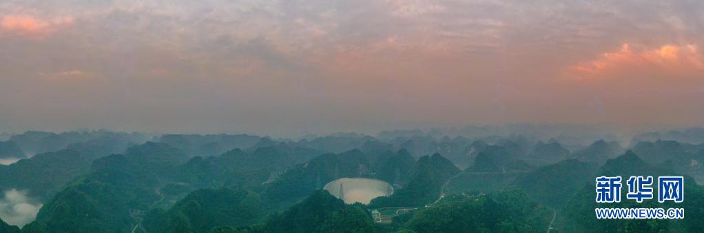 3月30日拍攝的朝霞中的“中國天眼”全景(維護保養期間拍攝,無人機照片)。