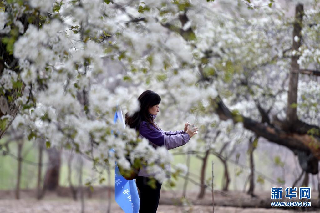 4月3日,游客在中衛市南長灘村拍攝盛開的梨花。
