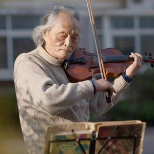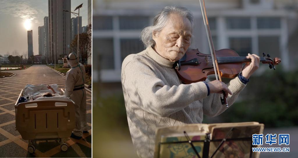這是一張拼版照片,左圖為:2020年3月5日傍晚,在湖北省武漢大學人民醫院東院,復旦大學附屬中山醫院支援湖北醫療隊醫生在護送患者王欣做CT的途中停下,讓住院近一個月的老人欣賞久違的日落(甘俊超 攝);右圖為:3月24日,“看夕陽的老人”王欣在東西湖區園藝花城小區內拉小提琴(新華社記者熊琦攝)。新華社發