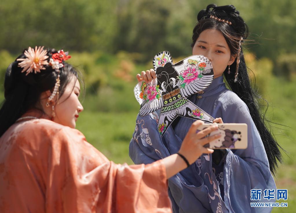 4月10日,人們在第二屆金陵風箏會上拍照留念。當日,第二屆金陵風箏會在江蘇省南京市浦口區永寧街道舉行。人們放飛風箏,歡度快樂時光。新華社記者 季春鵬 攝