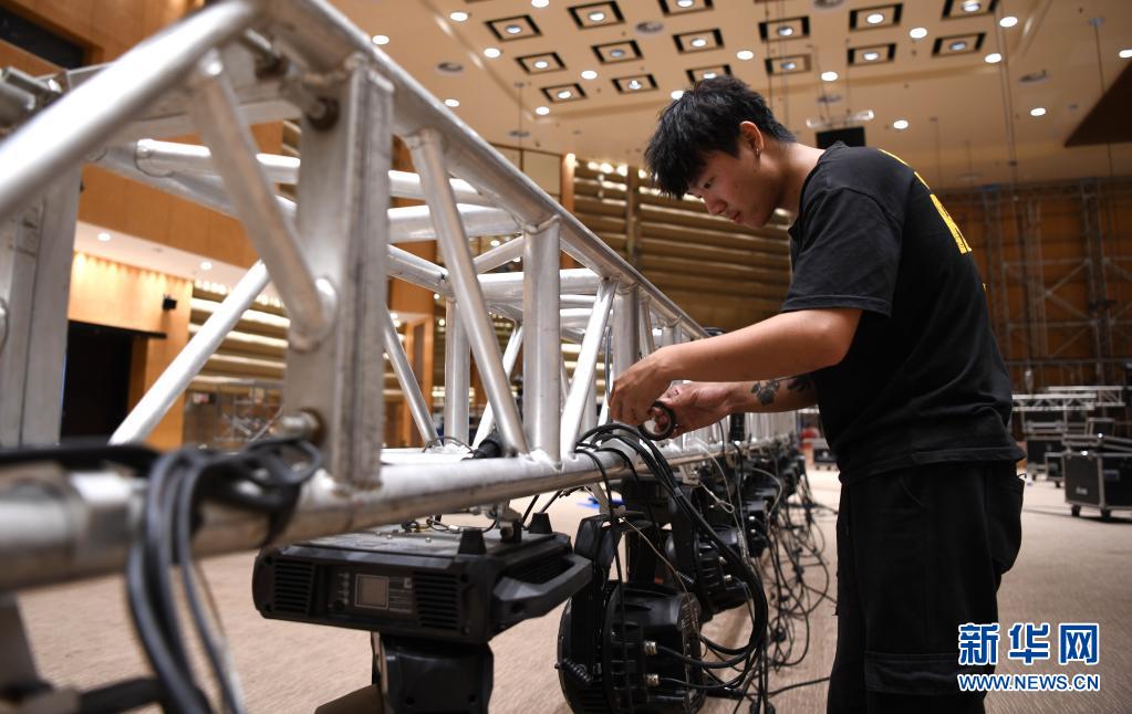 4月10日,工作人員在檢查主會場燈光設備。