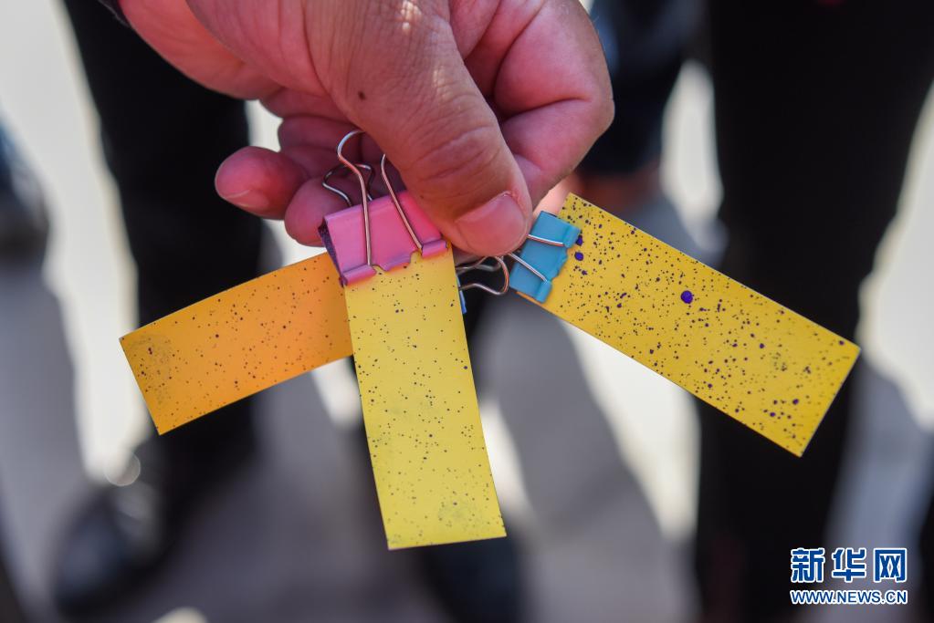 4月11日,在鐵門關(guān)市一處香梨示范園,技術(shù)人員檢驗(yàn)植保無(wú)人機(jī)花粉噴施效果。新華社記者 丁磊 攝