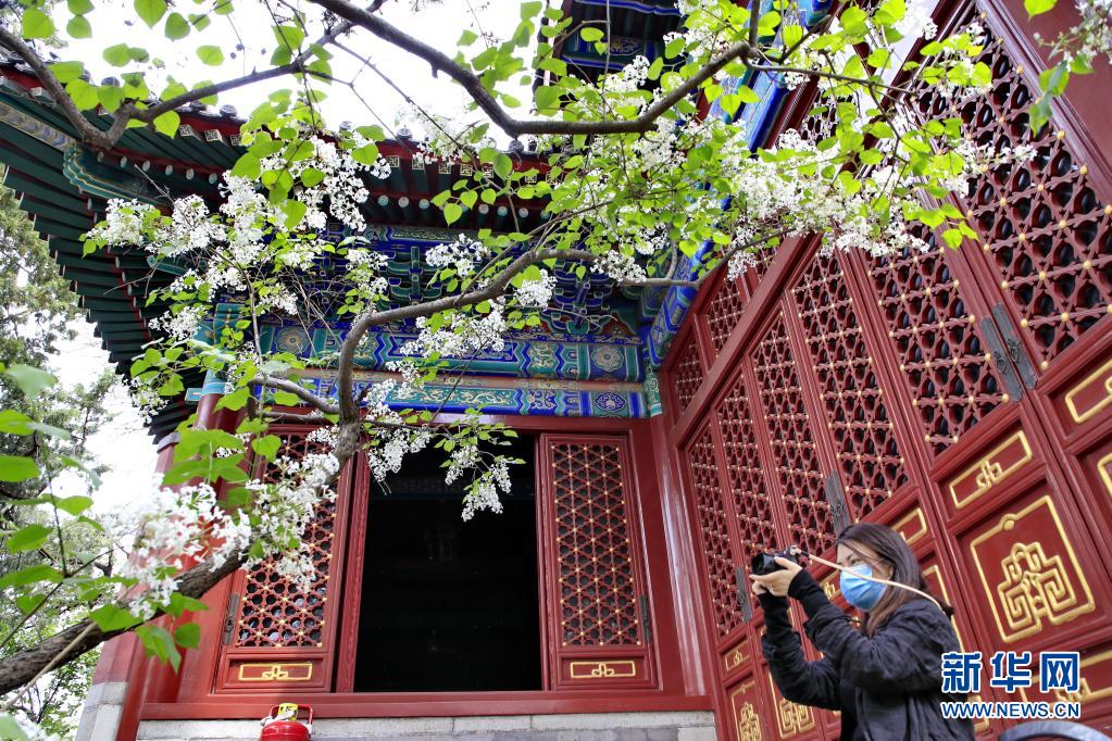 4月11日,游客在北京法源寺拍攝盛開的丁香花。新華社發(劉憲國 攝)