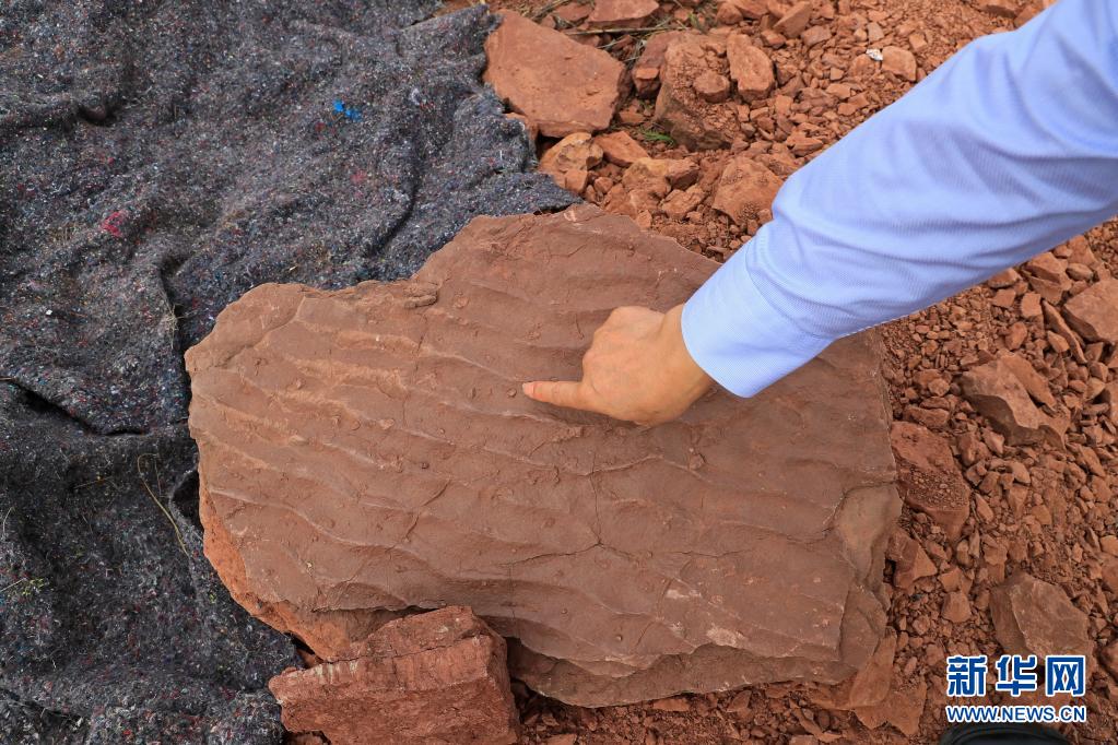 這是波痕沉積結構化石和晚白堊世恐龍同時期的底棲生物潛穴化石(4月6日攝)。