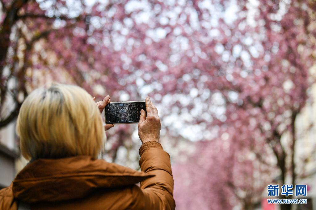 近日,德國西部城市波恩老城區的櫻花盛開,吸引了許多游人前來觀賞。