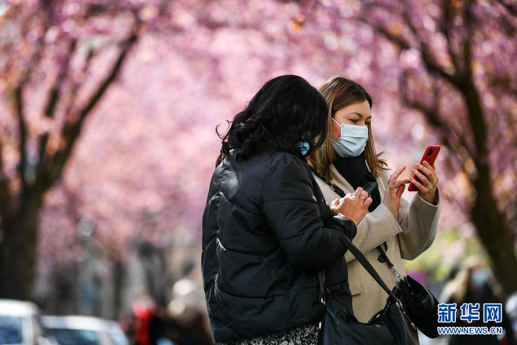 4月13日,兩名游人在德國(guó)波恩老城區(qū)用手機(jī)拍攝盛開(kāi)的櫻花。