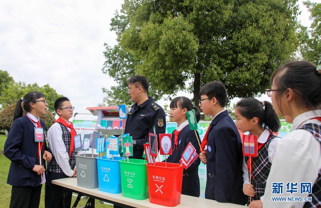 4月19日,工作人員向學生們講解垃圾分類、資源回收利用等常識。