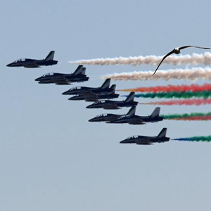 4月25日,意大利“三色箭”飛行表演隊在羅馬舉行的紀念儀式上噴出代表意大利國旗顏色的紅白綠三色煙霧。
