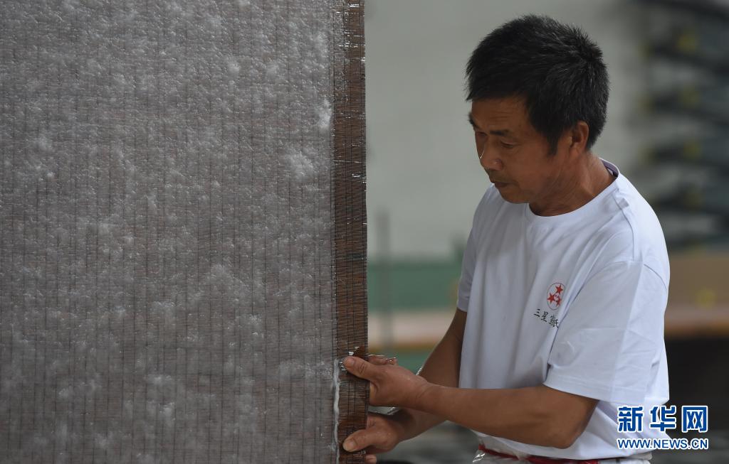 近日,在宣紙產地安徽省宣城市涇縣,“四丈宣紙”的抄制在一家紙業有限公司啟動。50余名撈紙師傅操作巨型紙簾,齊心協力,在紙槽旁進行撈紙作業。來回起落兩次,動作整齊劃一。隨后工人們將紙簾吊起放至一邊揭下,一張巨大的宣紙便撈制成功。經過曬、剪等工序后, 制成長13.2米、寬3.6米的巨型宣紙就是“四丈宣紙”。