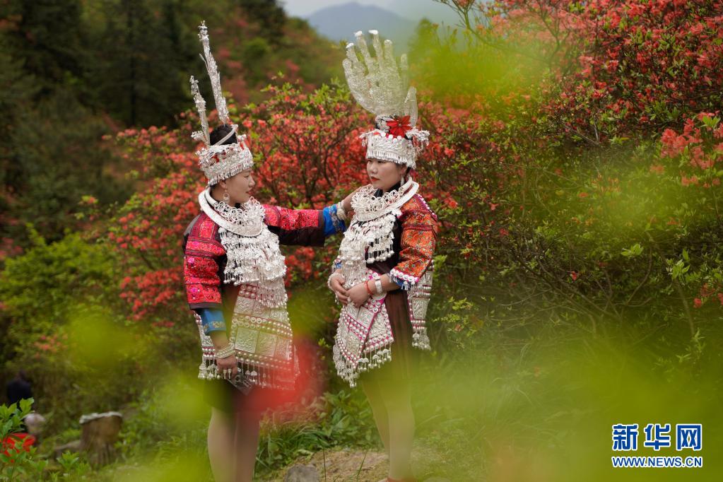 4月26日,游人在貴州省黔東南苗族侗族自治州丹寨縣龍泉山景區(qū)杜鵑花叢中游玩。近日,各地鮮花盛開,吸引人們走出家門踏青賞花。新華社發(fā)(楊武魁 攝)