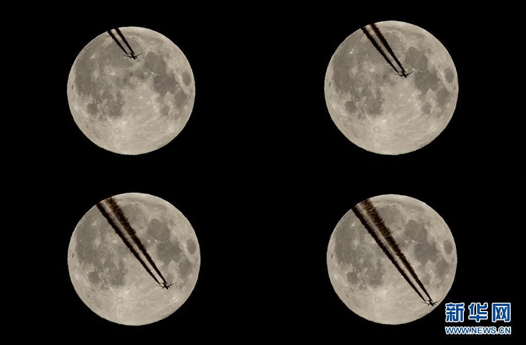 4月27日,一架飛機“飛過”法國巴黎上空的“超級月亮”(拼版照片)。新華社發(fā)(奧雷利安·莫里薩爾攝)