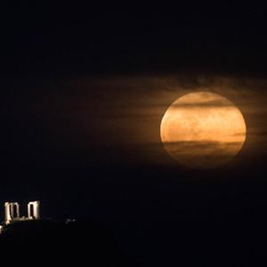 4月27日,“超級月亮”出現在希臘蘇尼翁的海神廟遺址上空。新華社發(馬里奧斯·羅洛斯 攝)