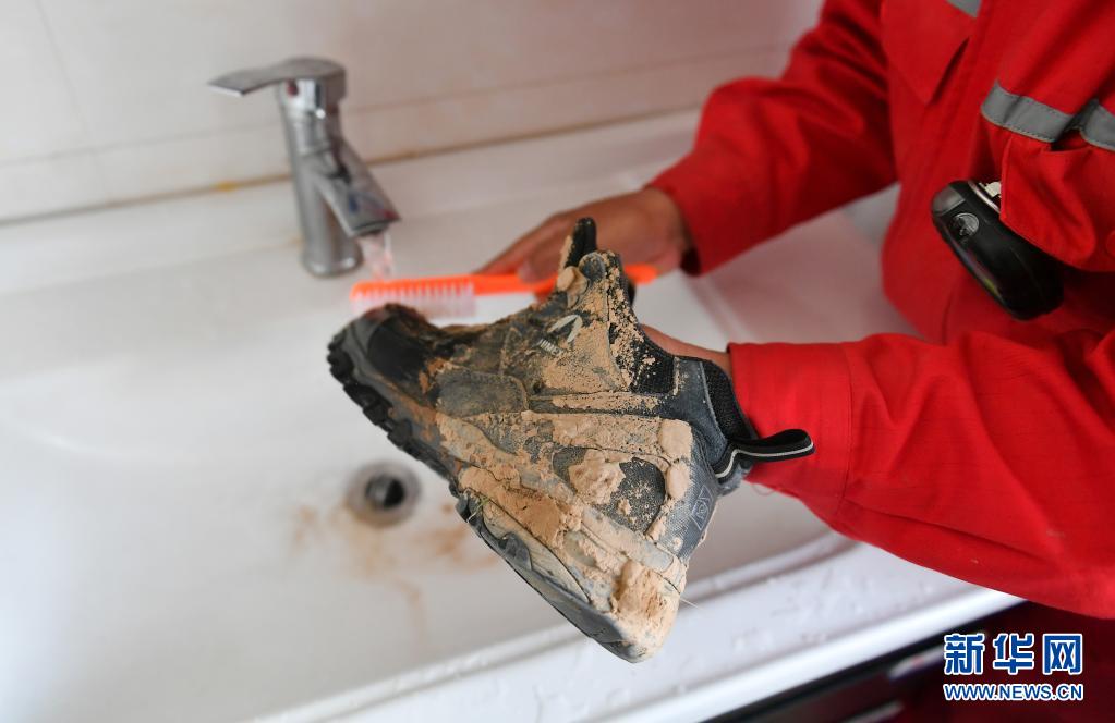 4月28日,巡線隊員侯勵峰結束巡線后清洗登山鞋。新華社記者 張博文 攝