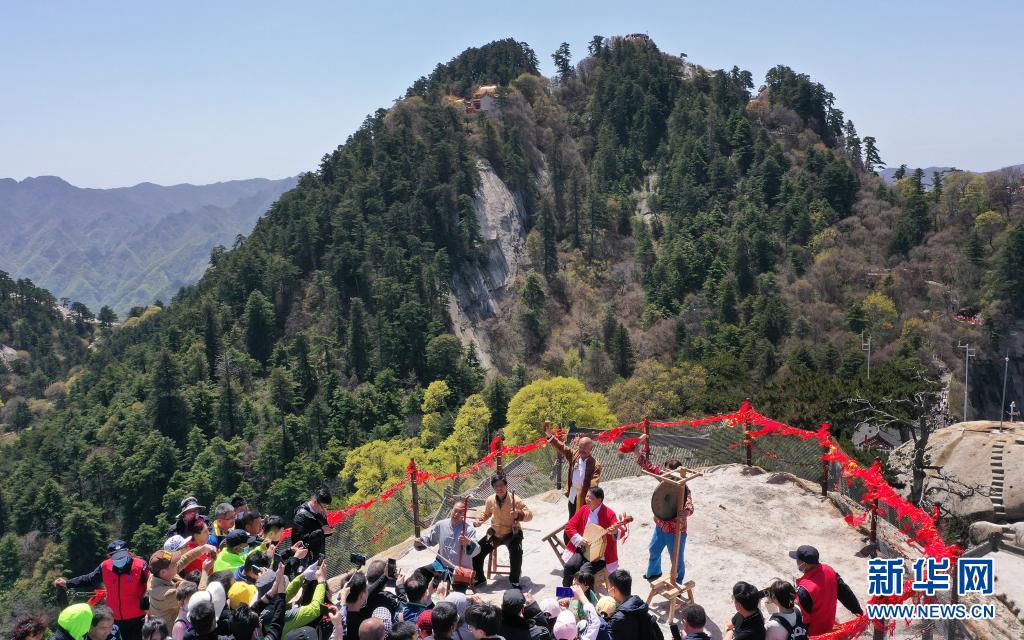 5月5日,華山景區西峰索道“華陰老腔團”在華山西峰之巔為游客表演(無人機照片)。