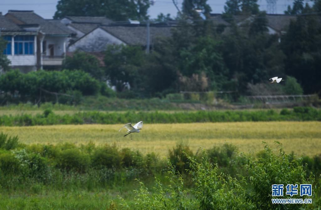 在東林鎮東升村,白鷺飛過麥田(5月7日攝)。