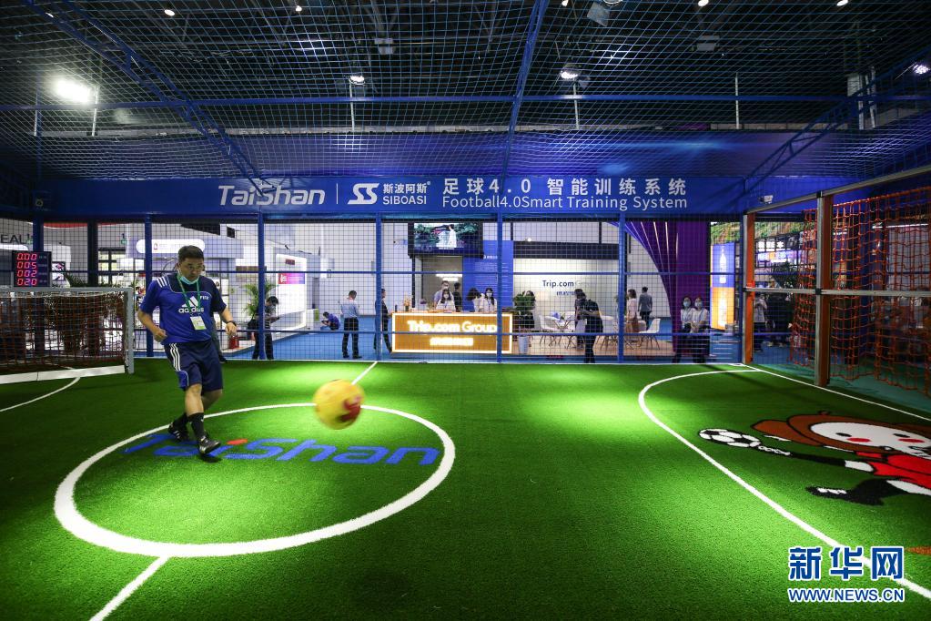 5月7日,參展商在消博會現場演示足球智能訓練系統(tǒng)。