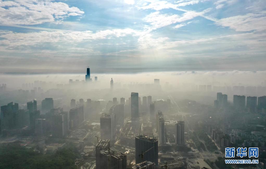 5月8日,貴陽市觀山湖區的高樓被霧氣籠罩(無人機照片)。