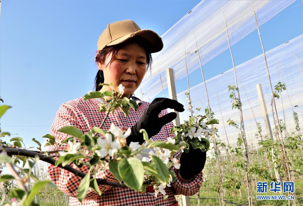 5月9日,在甘肅省平?jīng)鍪徐o寧縣城川鎮(zhèn)一蘋(píng)果有機(jī)示范園里,果農(nóng)在疏花。