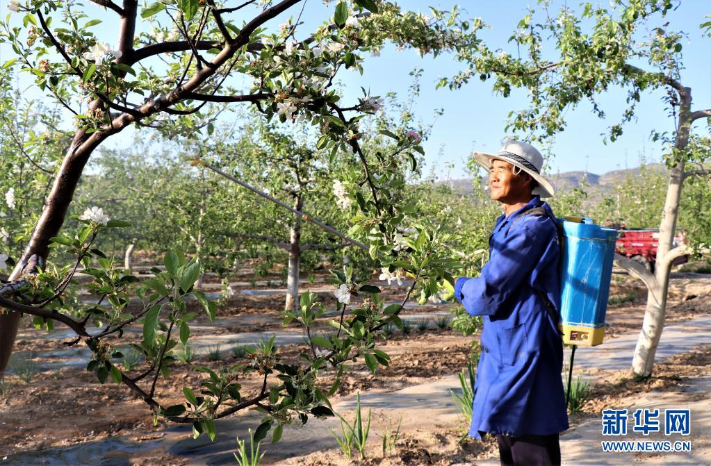 日前,隨著氣溫回升,甘肅省平涼市靜寧縣的百萬畝蘋果花相繼盛開,果農在果園里疏花、噴藥,田間地頭一派繁忙景象。